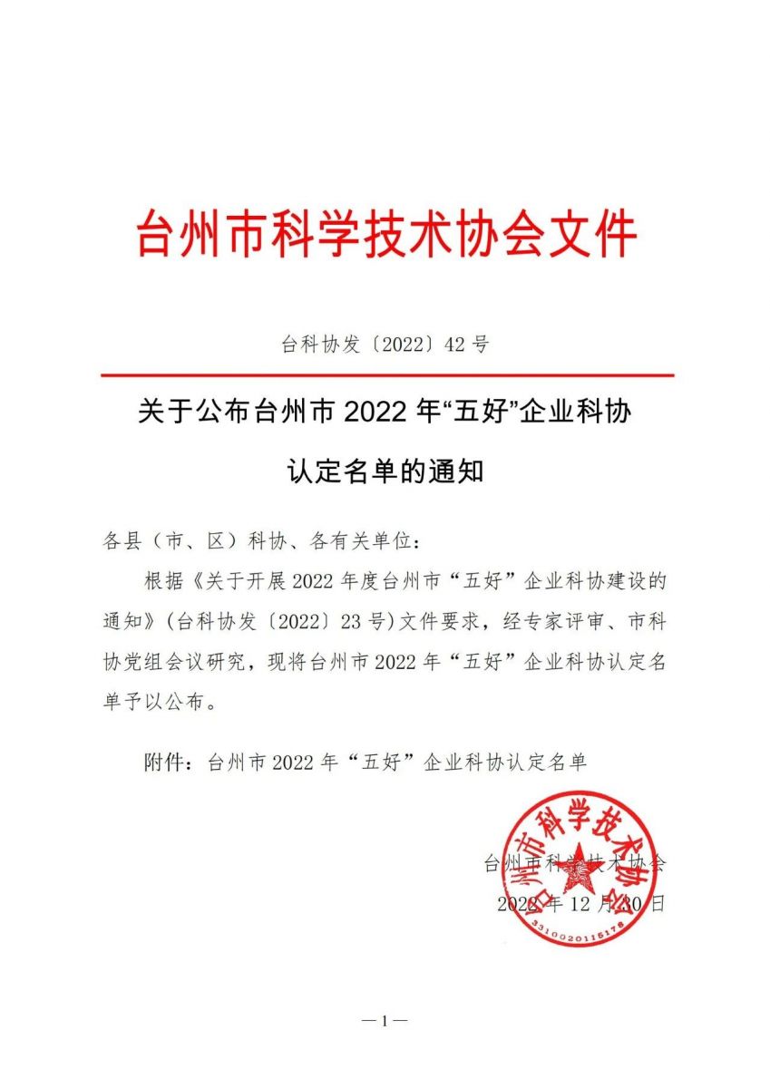 2022年12月30日,台州市科学技术协会发文对台州市 2022 年“五好”企业科协认定名单进行公布,其中浙江圣达生物药业股份有限公司成为天台唯一一家上榜企业。